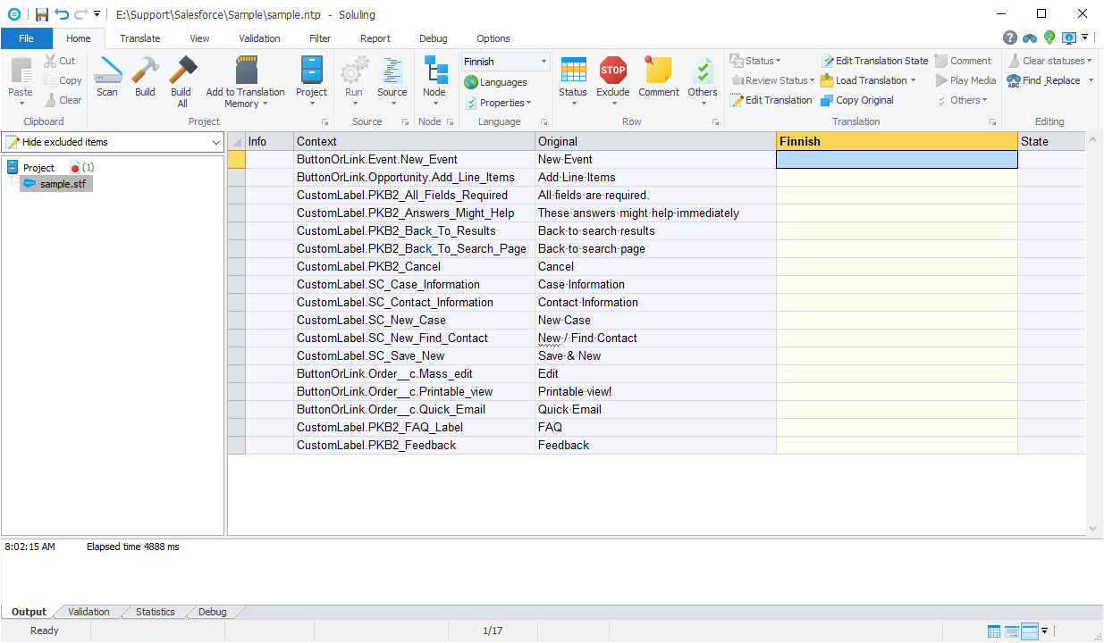 Click Build All button on the Soluling's ribbon bar to build the localized .stf file(s). Soluling creates sample_fi.stf, sample_de.stf and sample_ja.stf files. Finally, import the localized .stf file(s) to SalesForce using the Translation Workbench.